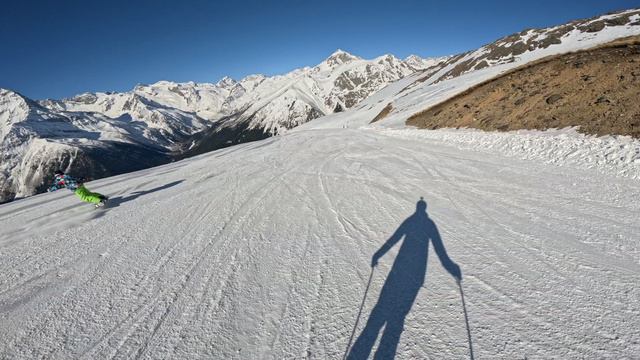 Очень приятная, равномерная, широкая трасса. Спускаемся в одно из лучших кафе курорта - "Домбайский вальс" Данное видео ни в коем случае не направлено на то, чтобы показать красивый спуск и правильную технику (её нет), оно носит исключительно развлекательный характер и даёт возможность насладиться прекрасными видами.
