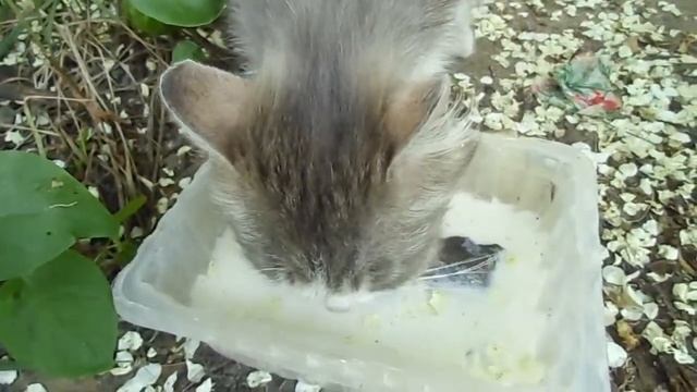 Дача. Проворная, пушистая и очень красивая кошка пьёт молоко. Оригинал - может исчезать на полгода.