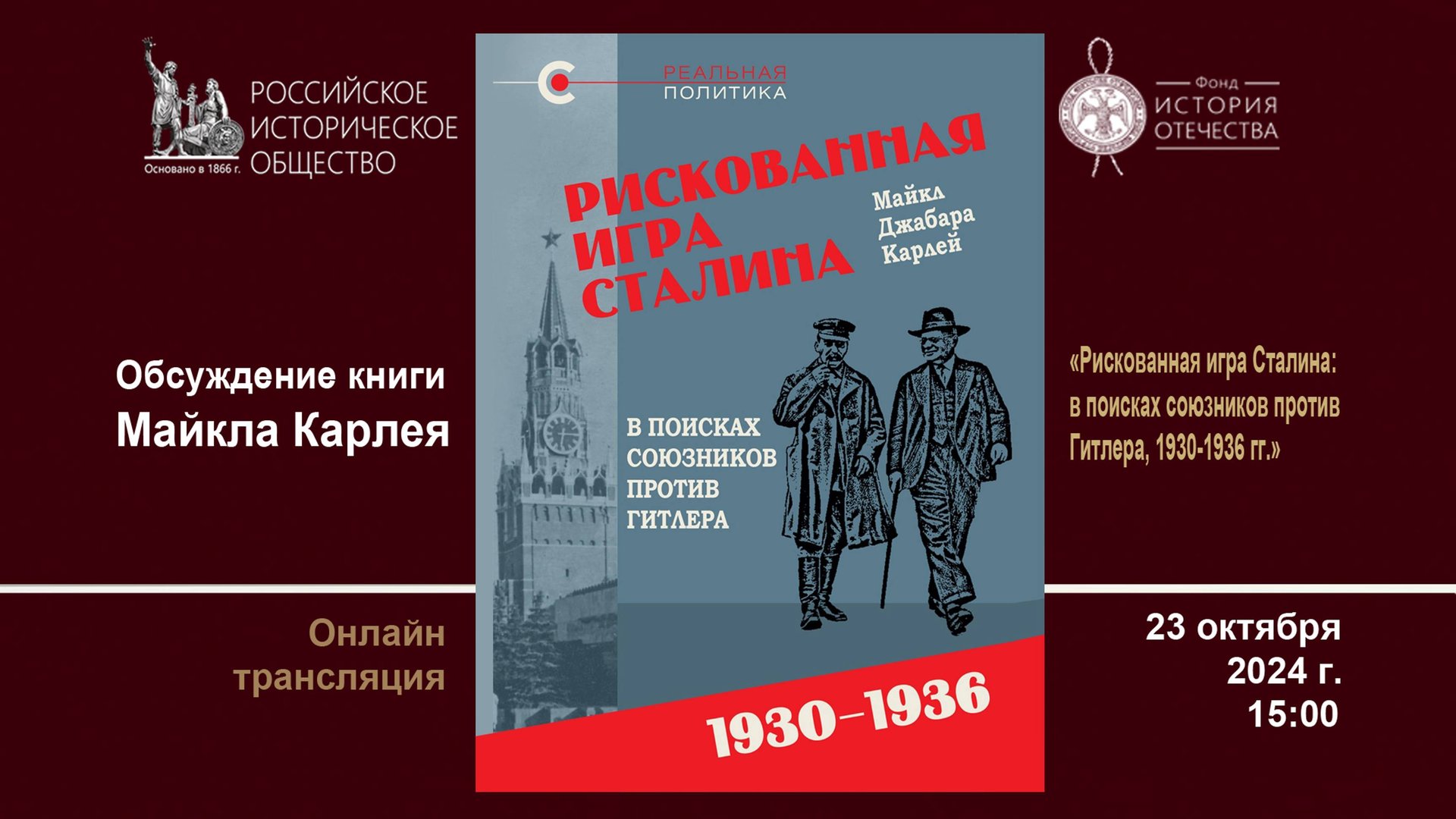 Онлайн трансляция презентации монографии канадского историка Майкла Карлея «Рискованная игра Сталина: в поисках союзников против Гитлера, 1930–1936 гг.». Этот фундаментальный труд Майкла Карлея создан на основе обширных материалов из архивов России, Франции, Великобритании, CШA. Отказавшись от антисоветских стереотипов, Карлей приходит к выводу, что провал советских дипломатических усилий, направленных на создание системы коллективной безопасности, был связан прежде всего с позицией западных стран, преследовавших собственные национальные интересы и не заинтересованных в паритетном сотрудничестве с СССР. Участие в мероприятии принял автор книги Майкл Карлей (онлайн), председатель Правления РИО Руслан Гагкуев, политолог Вероника Крашенинникова и другие специалисты.