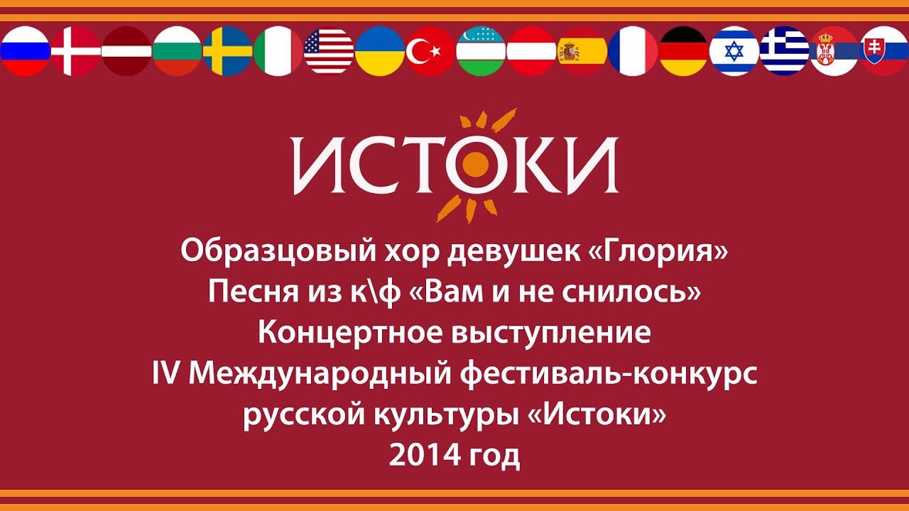 Образцовый хор девушек «Глория». Тверская область, город Конаково. Песня из к/ф «Вам и не снилось» Фестиваль-конкурс русской культуры «Истоки» ставит своей задачей показать многообразие и красоту русской культуры, которая на протяжении многих веков формировалась за счет традиций многонациональности и добрососедства. Фестиваль-конкурс русской культуры «Истоки» - многоплановое мероприятие, которое объединяет конкурс вокалистов, обширную экскурсионную и культурную программу, концертные выступления, гала-концерт и награждение участников фестиваля-конкурса. Мы расширяем русскоязычное пространство. Благодаря поддержке Россотрудничества в фестивале принимают участие дети-соотечественники, проживающие за рубежом. Сайт: www.festistoki.ru E-mail: festistoki@mail.ru