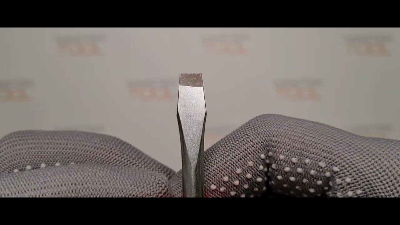 Плоская отвертка.Цилиндрический стержень, изготовленный из стали с символом S2, отверждается примерно до 58 HRC. Поверхность хвостовика сатинированная, рабочий наконечник отвержден и пескоструйный / это усиливает стабильность наконечника/. Ручка изготовлена из правильно подобранных пластмасс различной твердости.