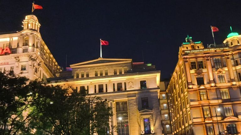 Набережная Шанхая: красные флаги и небоскрёбы