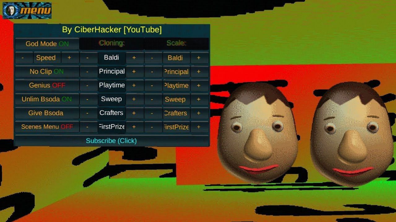 Music: Goblins from Mars - Never Coming Down {In the mod} Settings: 1)God Mode (on/off) 2)Speed (+/-) 3)No Clip (on/off) 4)Genius (on/off) 5)Unlim Bsoda (on/off) 6)Give Bsoda (Click) 7)Scenes Menu (on/off) Cloning: 1)Baldi (+/-) 2)Principal (+/-) 3)Playtime (+/-) 4)Sweep (+/-) 5)Crafters (+/-) 6)FirstPrize Scale: 1)Baldi (+/-) 2)Principal (+/-) 3)Playtime (+/-) 4)Sweep (+/-) 5)Crafters (+/-) 6)FirstPrize (+/-) Second Menu (in Easter Egg): 1)No Clip (on/off) Head Settings: 1)Amount (+/-) 2)Scale (+/-) 3)Width (+/-) 4)Height (+/-) Link - In The Description