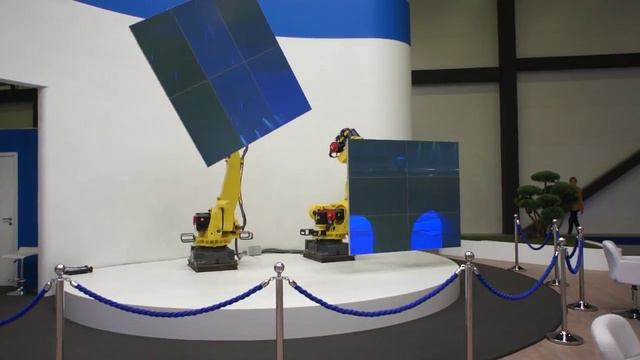 Посреди экспозоны гостей встречала инсталляция с огромными роботизированными руками, словно из фильмов о «Трансформерах», держащими большой полиэкран из 12 плазменных панелей. Такой полиэкран был визуально разделен на две равные части, которые крепились соответственно к правой и левой роборуке.