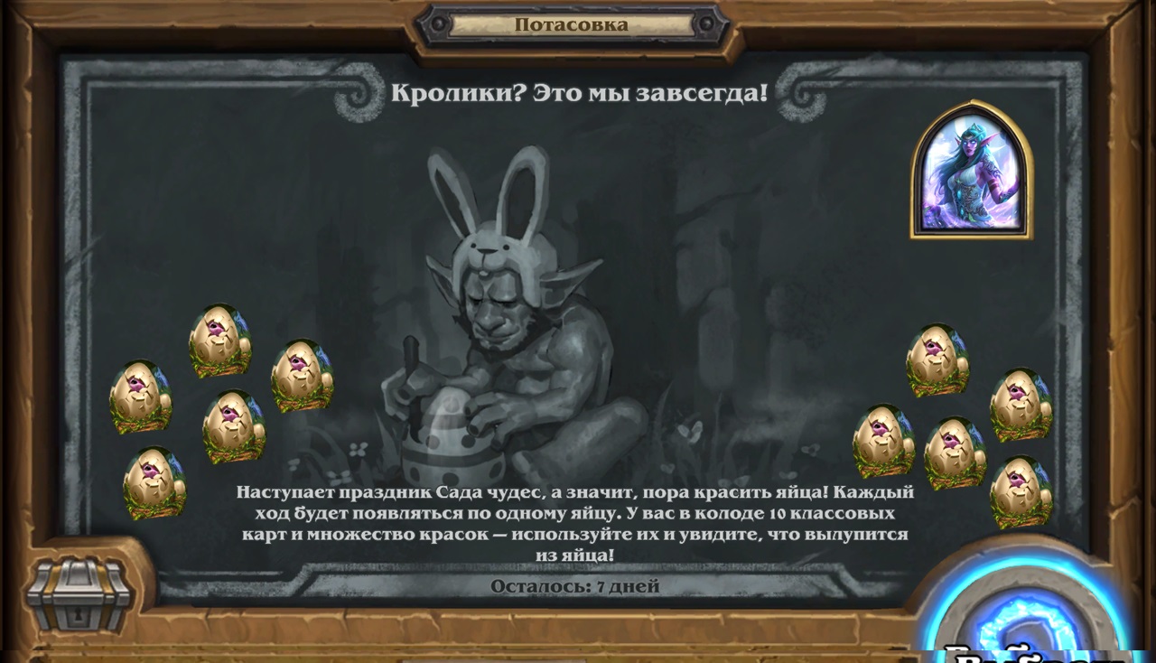 Потасовка в Hearthstone, в период с 11.05.2022 - 18.05.2022 Потасовка: Кролики? Это мы завсегда! Наступает праздник Сад чудес, а значи, пора красить яйца! Каждый ход будет появлятся по одному яйцу. У вас в колоде 10 классовых карт и множество красок - используйте их и увидите, что вылупится из яйца!