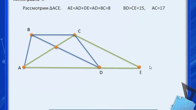 Типовые экзаменационные варианты по математике ОГЭ из сборника под редакцией И.В. Ященко 36 вариантов Вариант 24 25 задание Найдите площадь трапеции, диагонали которой равны 17 и 15, а средняя линия равна 4.