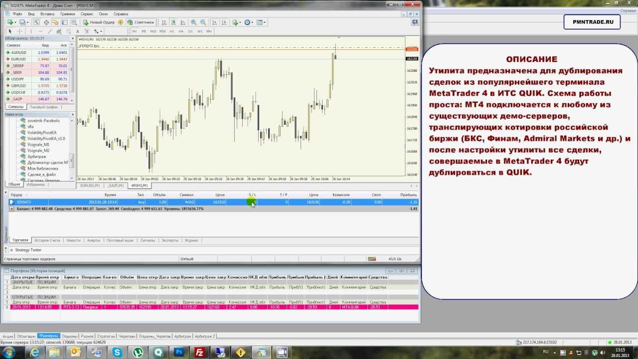 Страница программы: http://pmntrade.ru/double_trades_mt4-quik.html Утилита предназначена для дублирования сделок из популярнейшего терминала MetaTrader 4 в ИТС QUIK. Схема работы проста: MT4 подключается к любому из существующих демо-серверов, транслирующих котировки российской биржи (БКС, Финам, Admiral Markets и др.) и после настройки утилиты все сделки, совершаемые в MetaTrader 4 будут дублироваться в QUIK. - Возможность дублирования сделок из любого инструмента MetaTrader 4 в любой инструмент QUIK - Возможность дублирования сделок из нескольких копий MetaTrader 4 - Возможность дублирования нескольких схем одновременно - открытый код с описанием всех функций вплоть до каждой строки Внимание! Утилита работает только совместно с портфелем "История позиций".