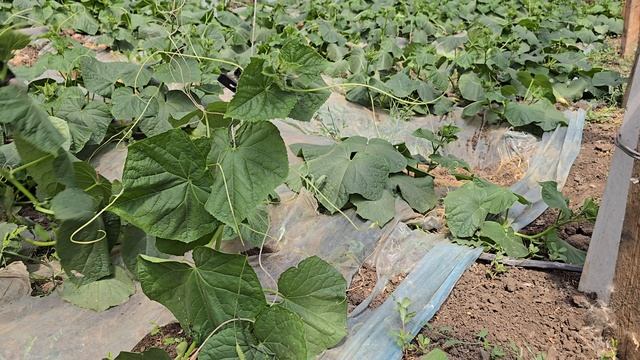 Первая подвязка огурца Мадрилене, китайские теплицы, июль 2025 год.