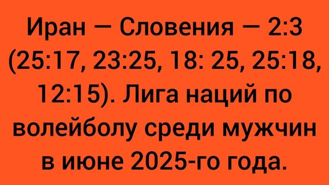 Иран — Словения — 2:3 (25:17, 23:25, 18: 25, 25:18, 12:15). Лига наций по волейболу среди мужчин.