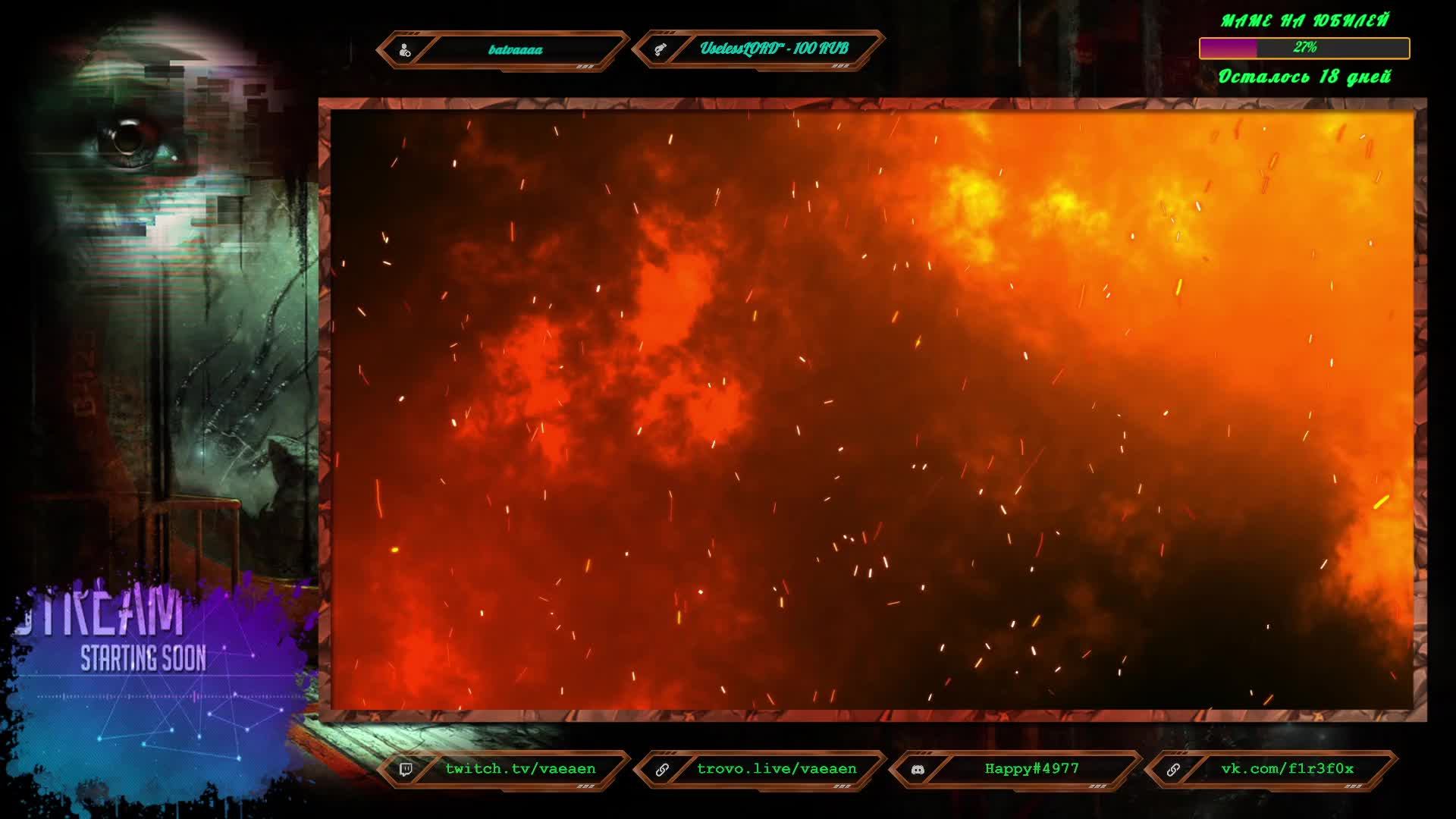 Если хотите поддержать меня как стримера - нажмите по данной ссылке! https://www.donationalerts.com/r/f1r3f0x Во время стрима ваше сообщение появится на экране, и будет сопровождаться голосовым диктором. Поддержка на Boosty - https://boosty.to/vaeaen Поддержка без комиссии: 2202 2010 0629 1039 Основные каналы: Twitch: https://www.twitch.tv/vaeaen Trovo: https://trovo.live/Vaeaen GoodGame: https://goodgame.ru/channel/Vaeaen/