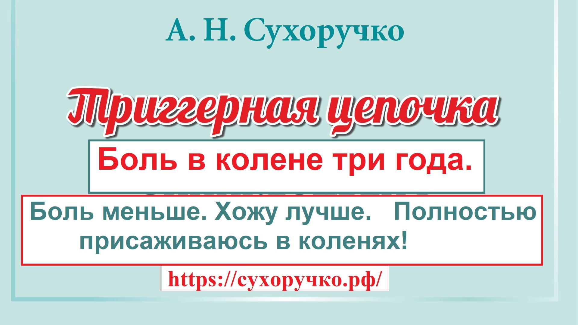 Боль в коленных суставах чаще вызывается воспалением межпозвоночного сустава L4-L5-S1 и образованием триггерных цепочек /склеротомалгий. Основным спазмом является тендомиоз фасции латэ, грушевидной, двуглавой (бицепс) мышцы. Правильный диагноз «Люмбоишиалгия, склеротомалгия С3-С4-С5-С6, тендиноз коленного сустава». Боль проприоцептивная распространяется по фасциям, а не по нервам. Нервная система в образовании боли в коленях не играет роли; диагнозы плексит, радикулит, корешковый синдром неверные. Изменения сухожильной, хрящевой, костной ткани в коленном суставе носит только травматический характер, установить срок этих изменений невозможно. Диагноз артроз в большинстве случаев неправильный. Показания к протезированию суставу не регламентированные, боль возвращается по признанию самих травматологов. Восстановить жидкость внутри сустава НЕВОЗМОЖНО НИКАКИМ ОБРАЗОМ! МРТ, УЗИ причину боли в коленях не показывают. Эффект от применения триггерной цепочки наступает после первой процедуры – боль ночью становится меньше. Оперативного лечения не требуется! Сухоручко А.Н. «Тендомиотерапия» — это русская инновационная концепция оздоровления организма, без: неврологии, лекарств, МРТ, УЗИ, нейрохирургии, остеопатии, мануальной терапии, костоправства, психотерапии, тренажёров. Концепция состоит из методик «Статик Про», «Триггерная цепочка», «Тонус Ап!», «Атлант СТ», «Гармония слова» (высылается ознакомительный файл). С помощью концепции устанавливается диагноз, определяется тактика оздоровления и профилактики; устраняются боли, головокружение, онемение; восстанавливается и укрепляется работа позвоночника, суставов; вертикализируется осанка; улучшается функция психической, сердечно-сосудистой, дыхательной, половой систем. Почувствуй легкость, энергию, силу — без мигрени, грыжи диска, остеохондроза, невралгий, артроза, сколиоза, панической атаки! Освободись от мифов неврологии, нейрохирургии, ортопедии, остеопатии; мануальной, висцеральной, кранио-сакральной, кинезиотерапий! Владей новой информацией и, будь здоров! Подробней читать в книге А.Н. Сухоручко "Триггерная цепочка. Энциклопедия здоровья позвоночника и суставов" / https://сухоручко.рф/