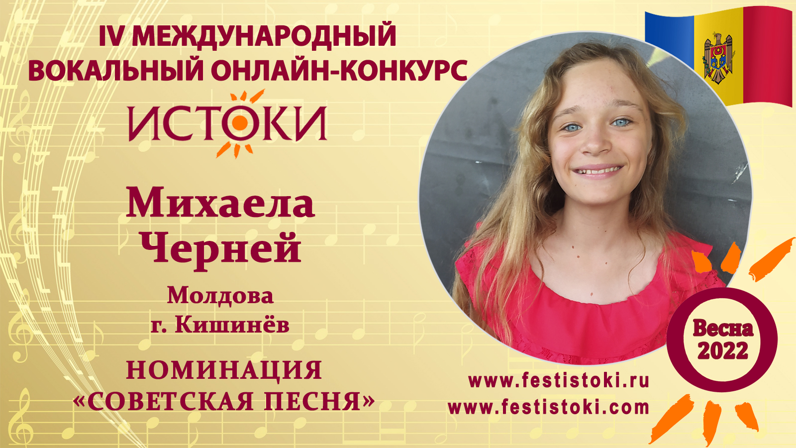 Лауреат II степени IV Международного вокального онлайн-конкурса «Истоки».Весна-2022. Номинация "Советская песня". Песня "Журчат ручьи". Музыка И. Дунаевского, слова М. Вольпина. Сайт: www.festistoki.ru / www.festistoki.com E-mail: festistoki@mail.ru