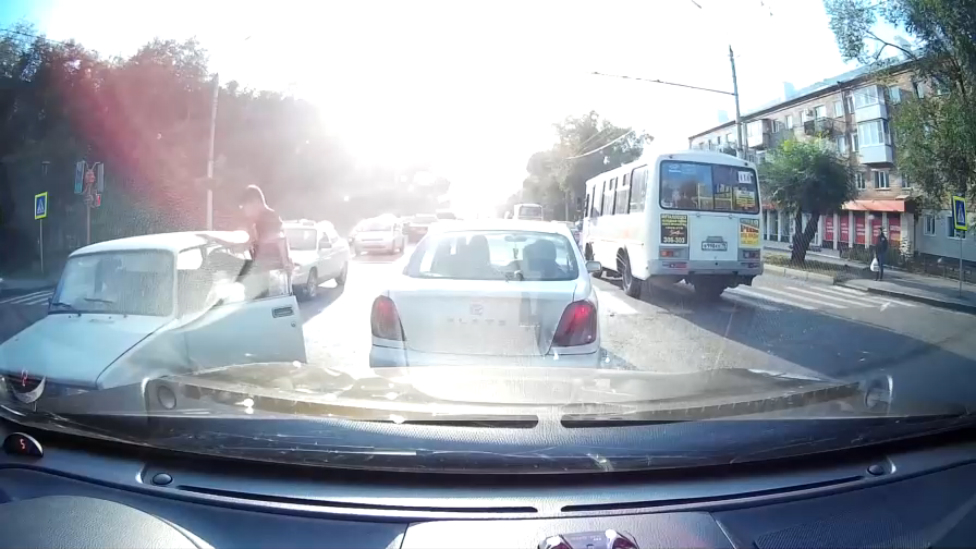 Снято на авторегистратор случайного очевидца - парень устроил драку на перекрестке с водителем, который не пропустил его девушку.