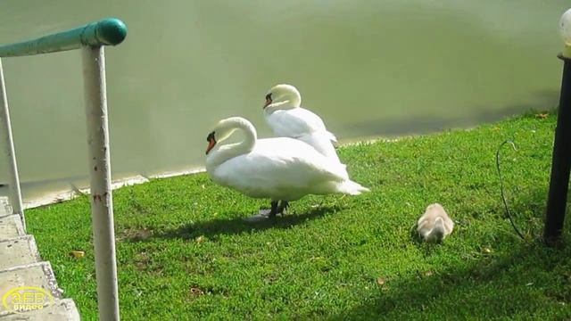 Белые лебеди на пруду. Люди приходят в парк отдохнуть и полюбоваться на красивых, почти ручных, грациозных птиц!