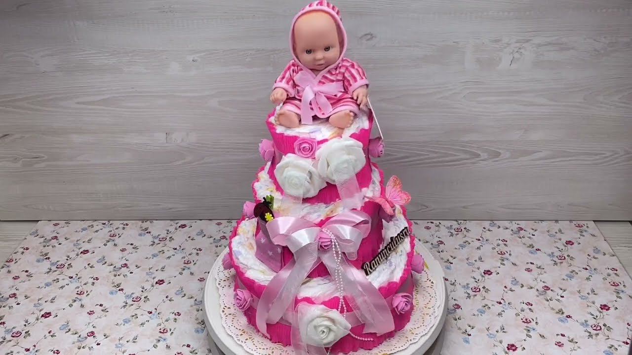 Розовый торт из памперсов с куклой для новорожденной девочки. Выбрать и купить торт из памперсов можно перейдя по ссылке https://ranunculus.ru/podarki-na-rozhdenie-rebenka/torty-iz-pampersov/ Сайт https://ranunculus.ru