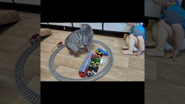 Видео про кошек Миша и Пушистик играют железной дорогой
