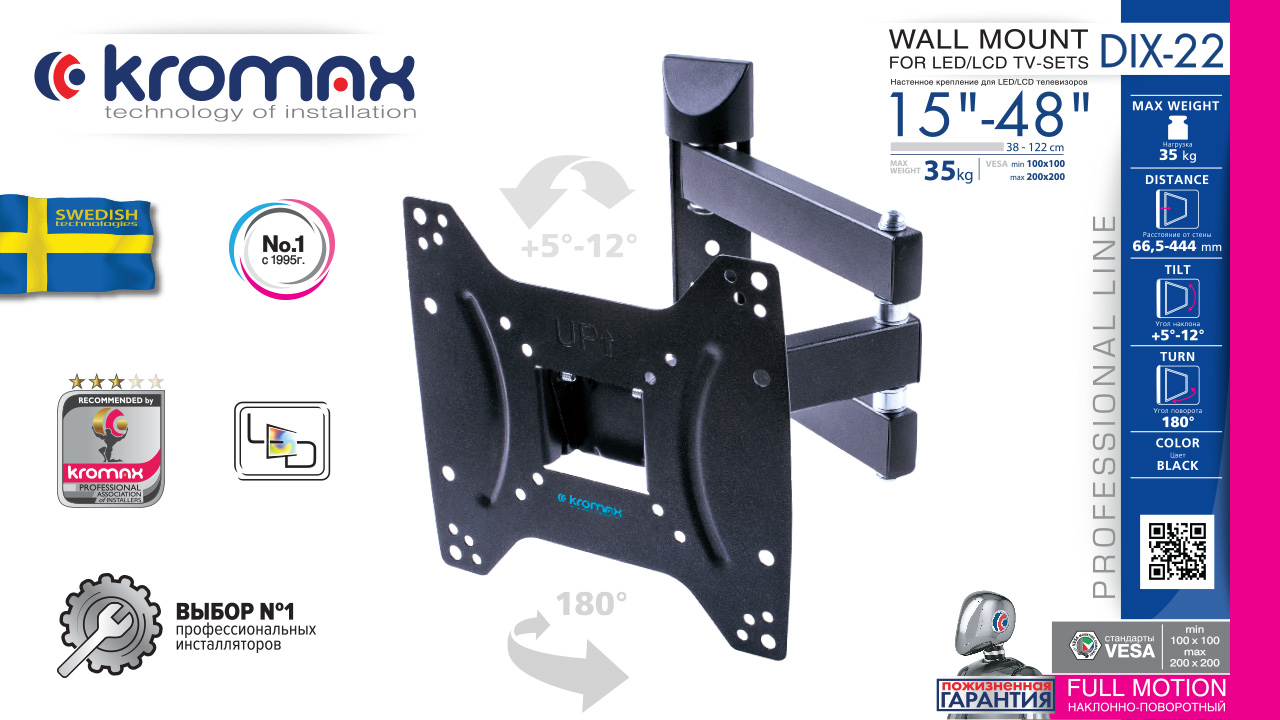 KROMAX DIX-22 BLACK надёжно удержит экран размером 15"-48" дюйма и весом 35 кг. Простая конструкция KROMAX DIX-22 BLACK идеально подойдет для самостоятельного монтажа. Наклонно-поворотная регулировка позволит наклонять вверх и вниз на +5 -12°, поворачивать влево и вправо на 180°, и выдвигать на 66.5-444 мм. Кронштейн подходит для большинства телевизоров популярных брендов, таких как Samsung, LG, Sony, Panasonic, Sharp, Toshiba, KIVI, Xiaomi Mi, SUPRA, Hyundai, Erisson, Horizont, JVC, Thomson, HAIER, BBK, Витязь, Веко, BQ, OZON, SkyLine, Pioneer, Philips, Rolsen, Harper, Hisense, Hitachi, Polarline, Prestigio и других. Крепёжные отверстия KROMAX DIX-22 BLACK изготовлены по стандарту VESA. В комплектацию KROMAX DIX-22 BLACK входят необходимые для монтажа материалы. Вся продукция обеспечивается гарантийными обязательствами. Пожизненная гарантия на все сварные и механические соединения позволит наслаждаться конструкцией долгий срок. Во время эксплуатации KROMAX DIX-22 BLACK демонстрирует поразительную износостойкость и безотказность. Подробнее https://www.kromax.ru/produce/pan_tilt/5466/