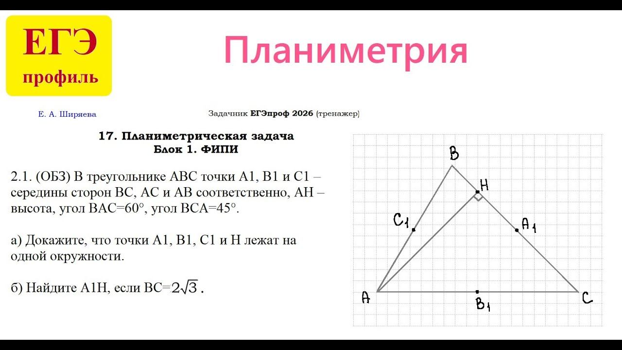 2.1. (ОБЗ) В треугольнике ABC точки A1, B1 и C1 – середины сторон BC, AC и AB соответственно, AH – высота, BAC=60°, BCA=45°. а) Докажите, что точки A1, B1, C1 и H лежат на одной окружности. б) Найдите A1H, если BC=2 корня из 3 .