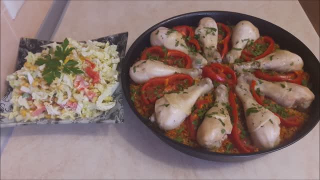 Телеграмм (telegram) https://t.me/cookingwithLOVE1 VK сообщество: https://vk.com/club225549357 ГОТОВИМ С ЛЮБОВЬЮ RUTUBE: https://rutube.ru/channel/29858979/ Ужин на Всю Семью Хватит каждому Рис с овощами и куриными голенями Салат Простой но очень Вкусный 1 кг куриных голеней (9 шт) 1 луковица 1 ст.л. томатной пасты 1 морковь 1 болгарский перец 1-2 помидора соль,перец 2 стакана риса (1 стакан -250 мл) 3 стакана бульона 30 минут при 180* Овощной салат 0,5 кочана пекинской капусты 0,5 болгарского перца 0,5 б. консервированной кукурузы домашний майонез или растительное масла