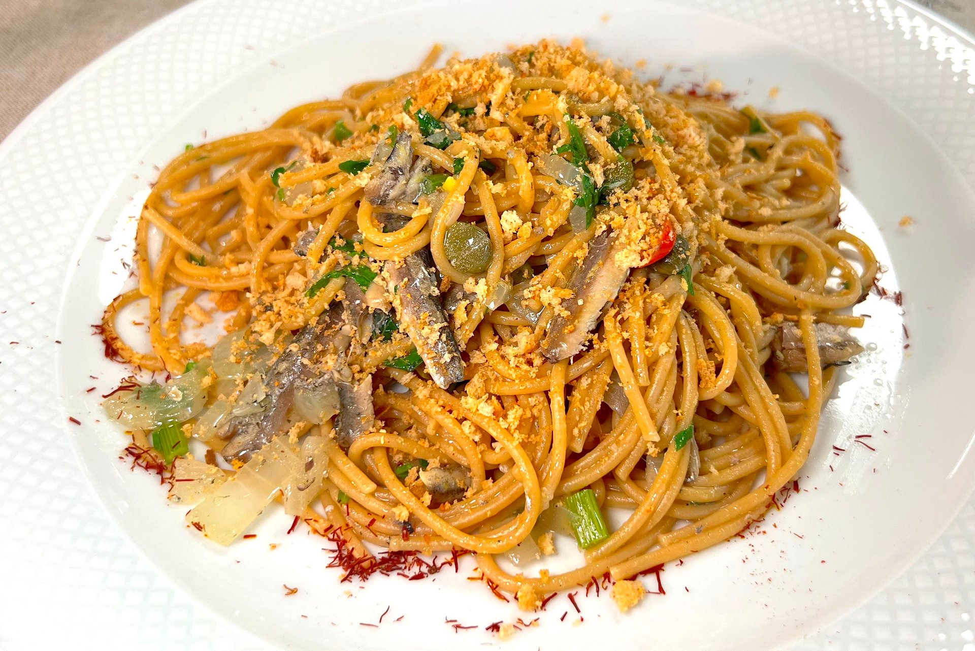 Если у вас случайно … или не случайно … завалялась в в шкафу или кладовке банка рыбных консервов, которую вы, по случаю, купили на черный день или в ожидании вселенского апокалипсиса … мы, советские люди, всегда храним подобный запас … а этот веселый день все не настает и нам приходится время от времени производить ревизию своего НЗ … ломая голову, что приготовить из спасательного круга, у которых истекает срок годности … я предлагаю древний рецепт родом из Сицилии … настолько древний, что Колумб еще не открыл Америку и соответственно никаких помидоров … только спагетти и рыбка … просто и очень вкусно ... Пока закипает вода для спагетти … лук мелко нарезать и обжарить на сковородке … добавить цедру лимона и каперсы … следом содержимое консервной банки … перемешиваем … всегда следуем итальянскому принципу … соус ждет пасту … отваренные спагетти аль денте смешиваем с нашей рыбкой … добавляем немного воды из под макарон … посыпаем петрушкой ... выкладываем на тарелку … обильно посыпаем сухариками … минимум телодвижений … замечательное и вкусное блюдо! Лучшим украшением будет шафран и бокал сухого!Приятного аппетита!