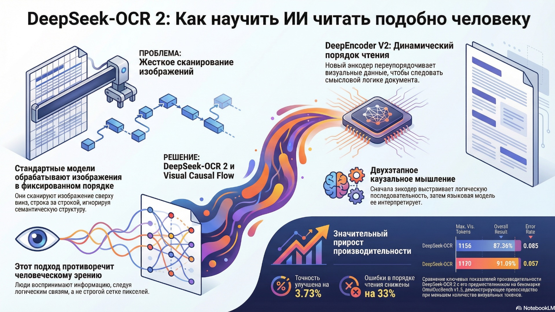 DeepSeek-OCR 2: Визуальный Причинный Поток DeepSeek-OCR 2 представляет новый кодировщик DeepEncoder V2, разработанный для преодоления ограничений традиционных моделей «зрение-язык» (VLM), которые жестко обрабатывают визуальные токены в растровом порядке. Вдохновленный человеческим зрительным восприятием, следующим гибким и семантически связным шаблонам сканирования, DeepEncoder V2 обеспечивает динамическое переупорядочивание визуальных токенов на основе семантики изображения. Эта новая архитектура наделяет кодировщик возможностями причинно-следственного рассуждения, приближаясь к более человекоподобному визуальному пониманию сложных 2D-данных, таких как документы. Ключевые инновации включают замену компонента CLIP компактной архитектурой LLM и введение обучаемых «запросов причинно-следственного потока» для прогрессивного переупорядочивания. Настраиваемая маска внимания позволяет визуальным токенам сохранять глобальные рецептивные поля, в то время как токены причинно-следственного потока получают способность переупорядочивать визуальную информацию. DeepSeek-OCR 2, используя DeepEncoder V2, достигает значительного улучшения производительности, в частности прироста на 3.73% на OmniDocBench v1.5, при сохранении эффективности. Исследование подтверждает целесообразность использования архитектур языковых моделей в качестве кодировщиков VLM, открывая путь к унифицированному омнимодальному кодированию и использованию оптимизаций инфраструктуры LLM. Проект сосредоточен на чтении документов как основной испытательной площадке из-за их внутренней причинно-следственной визуальной логики и сложных проблем макета. Код и веса модели DeepSeek-OCR 2 общедоступны. #DeepSeekOCR2 #ВизуальныйПричинныйПоток #DeepEncoderV2 #VLM #ПониманиеДокументов #ПричинноеРассуждение #ИИ документ - https://github.com/deepseek-ai/DeepSeek-OCR-2/blob/main/DeepSeek_OCR2_paper.pdf подписаться - https://t.me/arxivpaperu отправить донаты: USDT: 0xAA7B976c6A9A7ccC97A3B55B7fb353b6Cc8D1ef7 BTC: bc1q8972egrt38f5ye5klv3yye0996k2jjsz2zthpr ETH: 0xAA7B976c6A9A7ccC97A3B55B7fb353b6Cc8D1ef7 SOL: DXnz1nd6oVm7evDJk25Z2wFSstEH8mcA1dzWDCVjUj9e создано с помощью NotebookLM