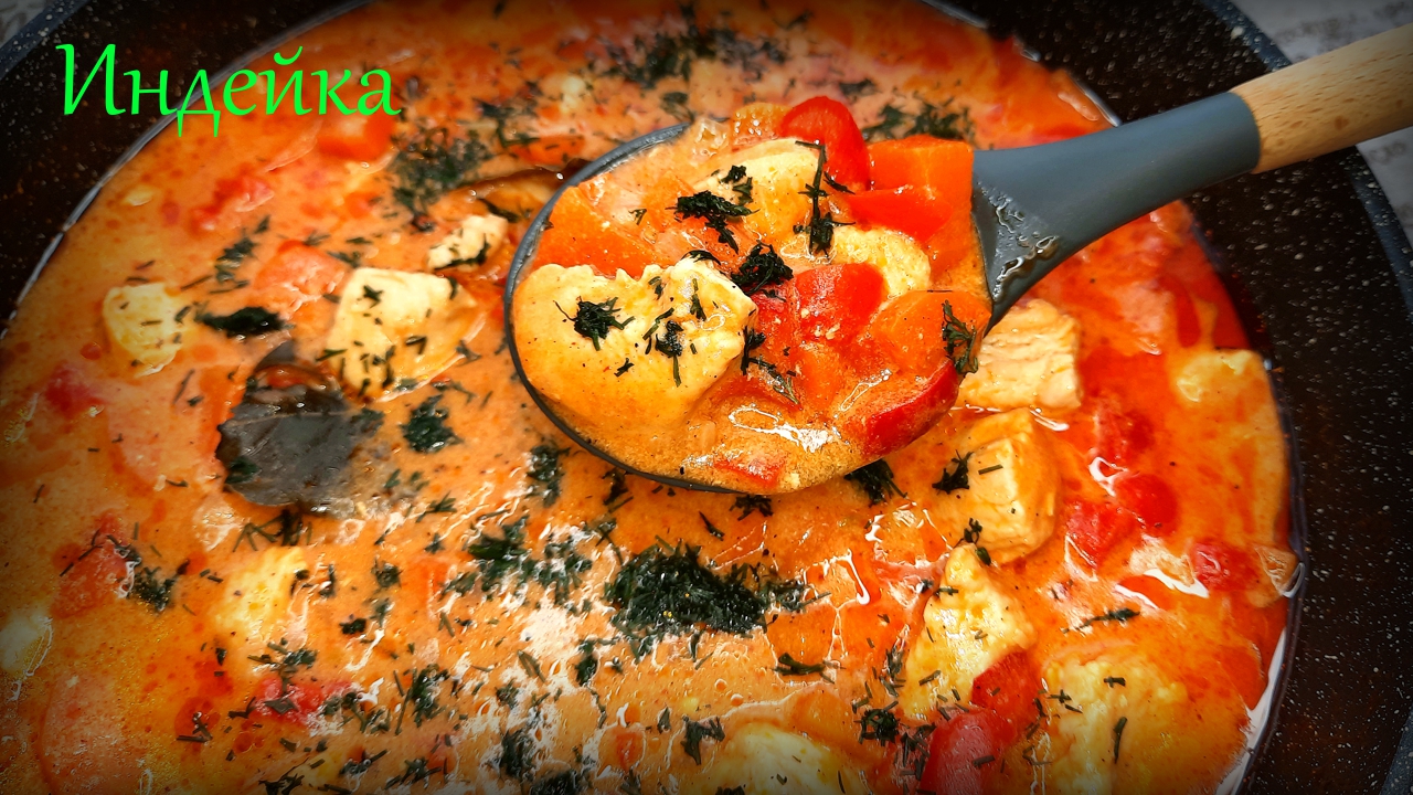 Индейка, тушенная с овощами в сметанно-томатном соусе.