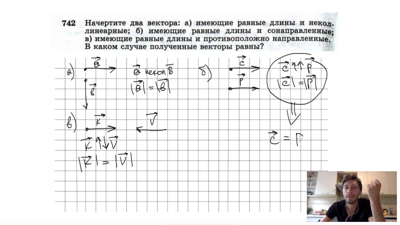 №742. Начертите два вектора: а) имеющие равные длины и неколлинеарные; б) имеющие равные длины и сонаправленные; в) имеющие равные длины и противоположно направленные. В каком случае полученные векторы равны? Мой второй канал для подготовки к ЕГЭ и ОГЭ - https://www.youtube.com/ЕвгенийСумин Инстаграм - https://www.instagram.com/EGE_OGE.math VK - https://vk.com/evgeniysumin FB - https://www.facebook.com/EvgeniySumin