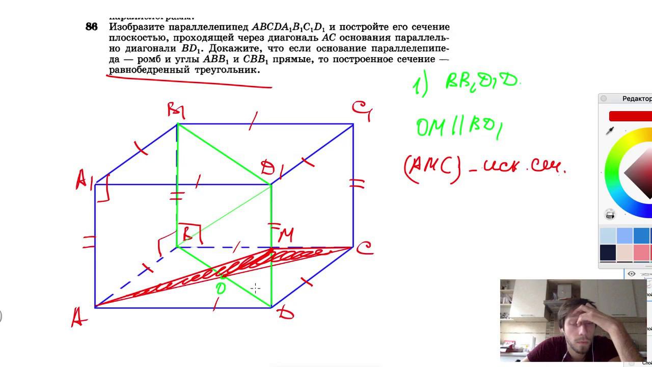 №86. Изобразите параллелепипед ABCDA1B1C1D1 и постройте его сечение плоскостью, проходящей через диагональ АС основания параллельно диагонали BD1. Докажите, что если основание параллелепипеда — ромб и углы АВВ1 и СВВ1 прямые, то построенное сечение — равнобедренный треугольник. Поддержать канал рублём - 5469400944002125 (Сбербанк) Мой второй канал для подготовки к ЕГЭ и ОГЭ - https://www.youtube.com/ЕвгенийСумин Инстаграм - https://www.instagram.com/EGE_OGE.math Личный инстаграм - https://www.instagram.com/ee_sumin VK - https://vk.com/evgeniysumin FB - https://www.facebook.com/EvgeniySumin
