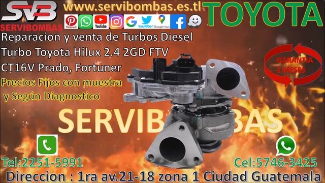 Turbos Toyota hilux 2.4 2GD De Geometria Variable Diesel contamos con turbos y cartuchos nuevos o la reparacion con garantia precios fijos con muestra y segun diagnostico todos los turbos toyota ,kia ,mazda ,ford ,perkins ,isuzu ,caterpillar ,mitsubishi ,jac ,foton ,mercedes ,hino ,nissan ud ,Detroit Diesel ,nissan, UD, dossan, mercedes ,bmw,John Derre,komatsu etc se pueden reparar con 2 meses de garantia Guatemala TEL:2251-5991 / CEL:5746-3425 Direccion:1ra av.21-18 zona 1 Ciudad Guatemala https://www.facebook.com/servibombasGT89 https://www.youtube.com/channel/UCBTWoLcpAHAAgd3uz4AdJ5Q https://www.pinterest.at/servibombas/_saved/ https://www.instagram.com/servibombasgt89/?hl=es