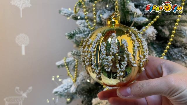 331600 Украшение елочное Шар блестящий с узором из белого бисера золотистый стекло 8см