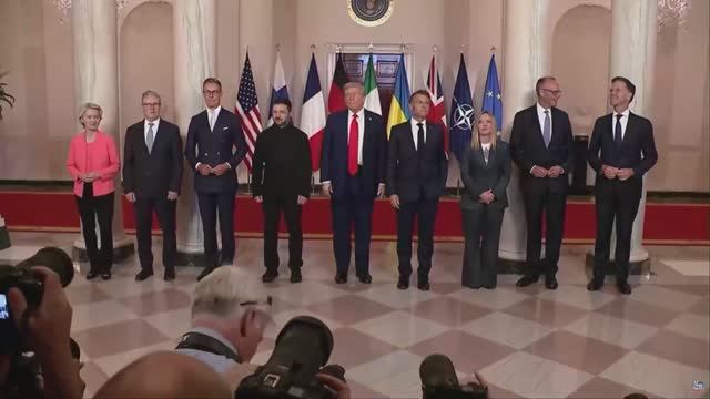 Трамп, Зеленский и лидеры ЕС фотографирование перед переговорами, 18 августа 2025 года