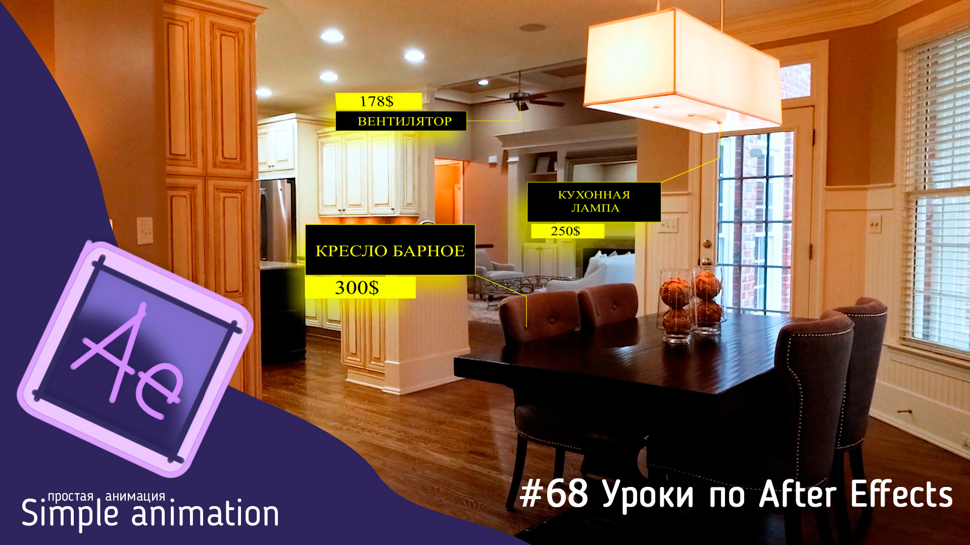 В данном уроке рассмотрим как сделать композицию с анимированным ценником, после чего сделаем трекинг и привяжем созданный ценник к определённому предмету находящемуся в видео. Файлы к уроку + проект AE: https://simple-animation.ru/video-uroki/139-treking-ceny-k-obektu-v-video.html