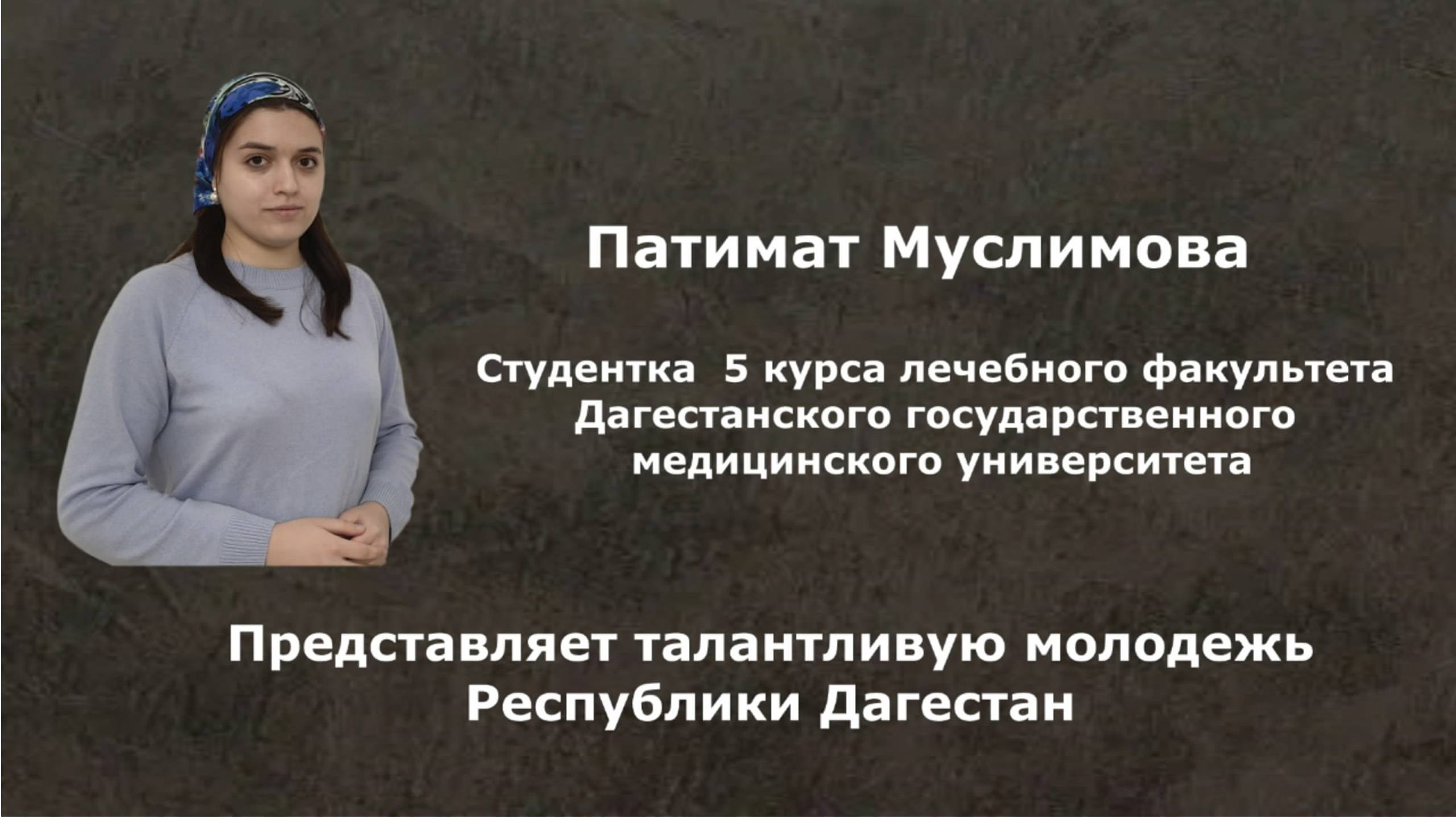 Документальный фильм о представителе талантливой молодежи Республики Дагестан из села Ансалта Ботлихского района Патимат Муслимовой. Патимат студентка 5 курса лечебного факультета Дагестанского государственного медицинского университета «Для меня медицина — это способ помочь людям. Она не существует сама по себе, а нужна для большей благородной цели», - уверена студентка. Она успешно совмещает учебу с наукой, увлекается исследованиями и многими другими активностями. Активистка студенческого научного кружка «Физиолэнд» может похвастаться не одной научной работой. Участница и победительница многочисленных научных всероссийских и международных конференций, форумов и конкурсов Муслимова главным своим достижением считает победу в Международном молодежном форуме «Горизонт 2100». В рамках форума она выступила со своей научно-исследовательской работой «От чувств к великой мысли», в которой описала свое видение развития медицины к 2100 году.