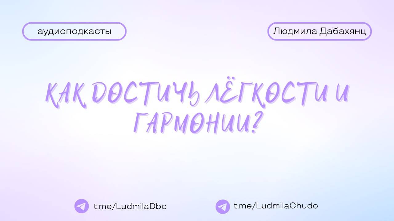 Аудиоподкаст Поступил вопрос: Как достичь легкости и гармонии ТЫ МОЖЕШЬ ПРИЙТИ СО СВОИМ ЗАПРОСОМ! Пишите в личку в telegram: https://t.me/ludmiladbc Теперь в одном месте ты можешь посмотреть: ✔️ чем я могу быть для тебя и... ✔️ что я могу дать тебе Переходи: https://t.me/ludmiladbc_bot ✓ Обязательно поставь 💗 ✓ Подпишись на канал ✓ И поделись с близкими Это будет вашим балансом за движение и получение энергии. Если есть желание создать баланс брать-давать... приму от всего сердца с благословением (донейшн). С Огромной Любовью, Дабахянц Людмила 💓 ✨ Telegram: https://t.me/ludmiladbc ✨ Канал в telegram “Я ЕСТЬ”: https://t.me/LudmilaChudo ✨Мой бот в telegram: https://t.me/ludmiladbc_bot ✨Онлайн-школа: https://ludmilachudo.skillspace.ru/school ✨Rutube: https://rutube.ru/channel/34371568/