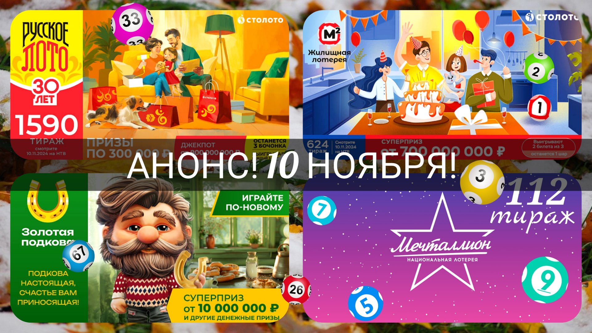АНОНС на 10 ноября.РУССКОЕ ЛОТО 1590 тираж| ЖИЛИЩНАЯ лотерея 624 тираж| ЗОЛОТАЯ ПОДКОВА 480 тираж.