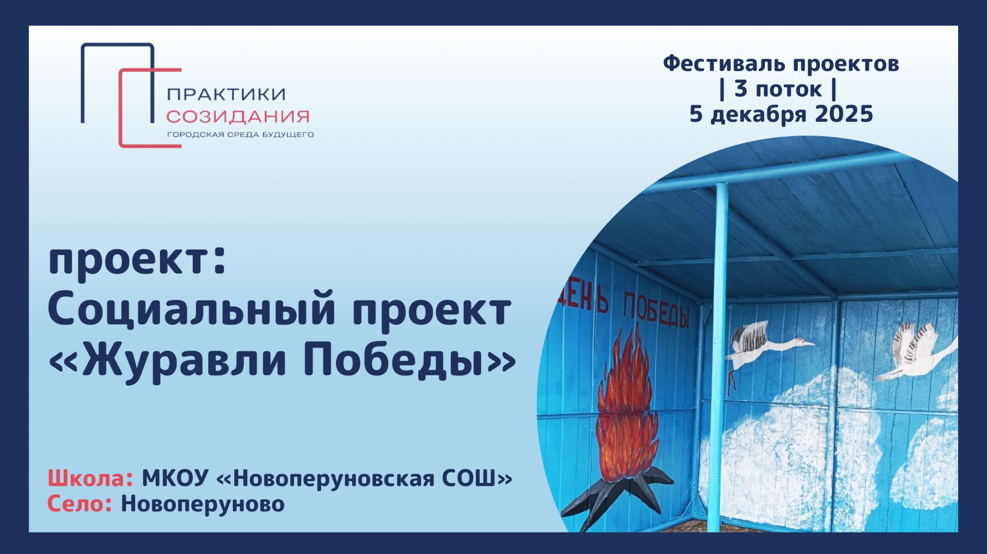 Визитка проекта "Социальный проект «Журавли Победы»" в рамках фестиваля молодежных проектов «Практики созидания. Городская среда будущего» Дата проведения фестиваля: 5 декабря 2025 года Село: Новоперуново, Алтайский край Школа: МКОУ «Новоперуновская СОШ» Ссылка на паспорт проекта: https://disk.yandex.by/i/V8BVbGTyOPWcow