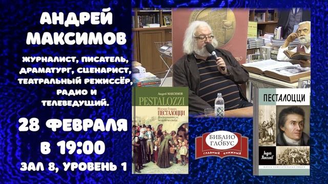 28 февраля приглашаем на презентацию новой книги Андрея Максимова «Песталоцци: Воспитатель человечества» (https://www.bgshop.ru/Catalog/GetFullDescription?id=10907990&type=1)! Иоганн Генрих Песталоцци – великий швейцарский педагог, философ, писатель. Созданные им педагогические системы не просто актуальны для нашего времени, но опережают его. Песталоцци — создатель методов, которые сегодня каждый родитель может использовать в воспитании своего ребенка. Автор книги Андрей Максимов постарался рассказать не только о системе, но о совершенно невероятной, авантюрной, полной падений и взлетов жизни швейцарского гения. Андрей Максимов — журналист, писатель, драматург, радио-и телеведущий, сценарист, театральный режиссёр. --- «Библио-Глобус» – старейший книжный магазин в самом центре Москвы и один из крупнейших в Европе. У нас вы можете найти книгу на любой вкус из 200 тысяч наименований. Мы предлагаем широкий выбор изданий на более чем тридцати иностранных языках. Ежедневно мы проводим встречи с вашими любимыми авторами и ждём вас на заседаниях наших читательских клубов по интересам. Все права на настоящие аудио-, видеоматериалы защищены и охраняются законом. Использование материалов без согласия ООО Торговый Дом «БИБЛИО-ГЛОБУС» не допускается. Наш сайт: http://www.biblio-globus.ru/ Мы в социальных сетях: VK: https://vk.com/biblioglobus_msk Telegram: https://t.me/biblioglobus_1 Twitter: https://twitter.com/Biblio_Globus С любовью, Ваш Библио-Глобус.