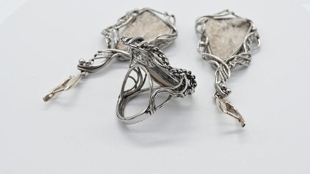 •Авторское украшение ручной работы. Камни установлены в оправу из ювелирного сплава - нейзильбер. •Форма и рисунок камня никогда не повторяются, что делает данное изделие единственным в своем роде. •Габарит кольца 27*38мм, серьги: 27*47мм., вес 14,6 г •Швензы изготовлены из серебра проба отсутствует. •Указаны габариты серьги без швензы.