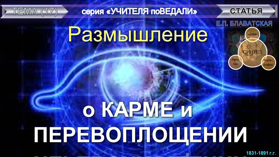 Статьи Блаватской Е.П. РАЗМЫШЛЕНИЕ О КАРМЕ И ПЕРЕВОПЛОЩЕНИИ из серии"Учителя поВедали", в которую входят аудио-видео тома, составленные и (или) скомпонованные Небесной Нитью (НН) на разные заданные темы из Записей воплощенных Учителей Земли. "Синтез науки, религии и философии" - так обозначила суть своих трудов сама Елена Петровна Блаватская (1831-1891 г.г.) - великая наша соотечественница (урожденная Ган в г. Екатеринослав Российской империи, позднее переименованный г. Днепропетровск УССР, ныне в г. Днепр Украина), - стоявшая у истоков экстраординарного мировоззрения, основательница Теософского Общества (1875 Нью-Йорк).