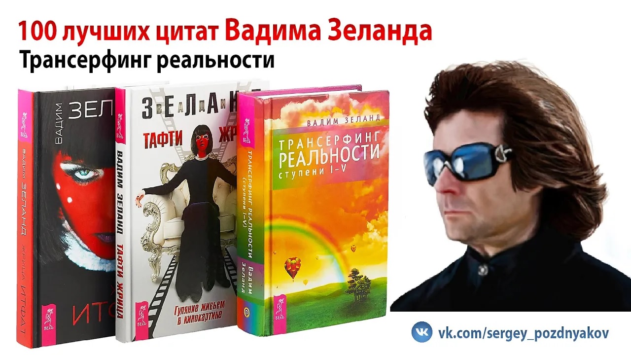 100 лучших цитат Вадима Зеланда Трансерфинг реальности Сегодня я хочу рассказать вам о Трансерфинги реальности — это эзотерическое учение, созданное в 2004 году на основе одноимённой серии книг, автором которых является Вадим Зеланд. Он описывает своё учение о технике, способной концентрировать энергию мыслей для претворения желаемого варианта развития событий. Вадим Зеланд ссылается на идею мультивариантного мира. Авторство словосочетания "трансерфинг реальности" (или просто "трансерфинг") принадлежит самому автору, Вадиму Зеланду. По его версии, термин указывает на "скольжение" по "линиям жизни", подобно сёрфингу; это "скольжение через пространство вариантов" или "трансформация потенциально возможного варианта в реальность", или "переход через линии жизни" В данном видео я расскажу вам 100 лучших цитат Вадима Зеланда - Подписывайтесь на мой канал в YOUtube https://www.youtube.com/channel/UCQBy3iEELc0ltPAt_gkCkOQ - Я в Rutube https://rutube.ru/channel/26552914/ - Я VK https://vk.com/sergey_pozdnyakov - Я в ОК https://ok.ru/group51148294651980 - Я в Яндекс Дзен https://zen.yandex.ru/id/608c778a1f08643617f9a192 - Я RUS https://vk.com/away.php?utf=1&to=https%3A%2F%2Fyarus.ru%2Fu%2F7244001 - Моя БИБЛИОТЕКА https://vk.com/market-11000336?section=album_1 - #ВадимЗеланд #Трансерфингреальности #Эзотерика #психология #ЖрицаИтфат