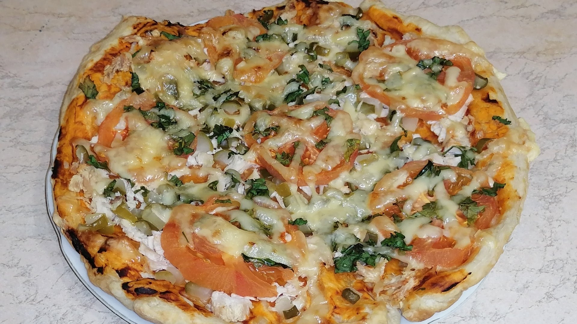 Пицца на слоёном корже с курицей, помидорами и солёными огурцами