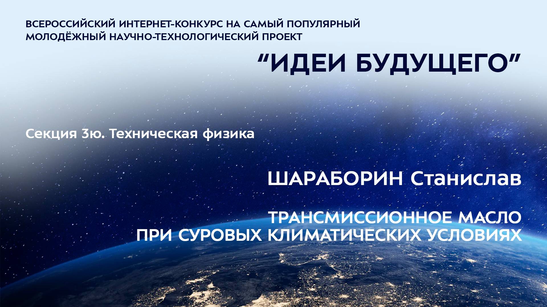 (3Ю-13) ШАРАБОРИН Станислав Эдуардович Республика Саха (Якутия), г. Якутск Ассоциация образовательных учреждений с инженерно-политехнической направленностью, 3 класс ТРАНСМИССИОННОЕ МАСЛО ПРИ СУРОВЫХ КЛИМАТИЧЕСКИХ УСЛОВИЯХ Научный руководитель: Эверстова Нюргуяна Тихоновна, Республика Саха (Якутия), г. Якутск, Ассоциация образовательных учреждений с инженерно-политехнической направленностью, учитель начальных классов Более подробно о мероприятиях Программы "Шаг в будущее" можно узнать на сайтах http://www.step-into-the-future.ru/ и http://шагвбудущее.рф