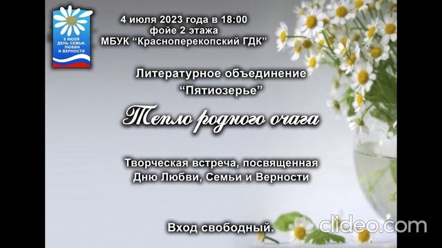 8 июЛЯ ДЕНЬ СЕМЬИ, ЛЮБВИ И ВЕРНОСТИ 4 июля 2023 года в 18:00 фойе 2 этажа МБУК "Красноперекопский ГДК" Литературное объединение "Пятиозерье" Тепло родного очага Творческая встреча, посвященная Дню Любви, Семьи и Верности Вход свободный.