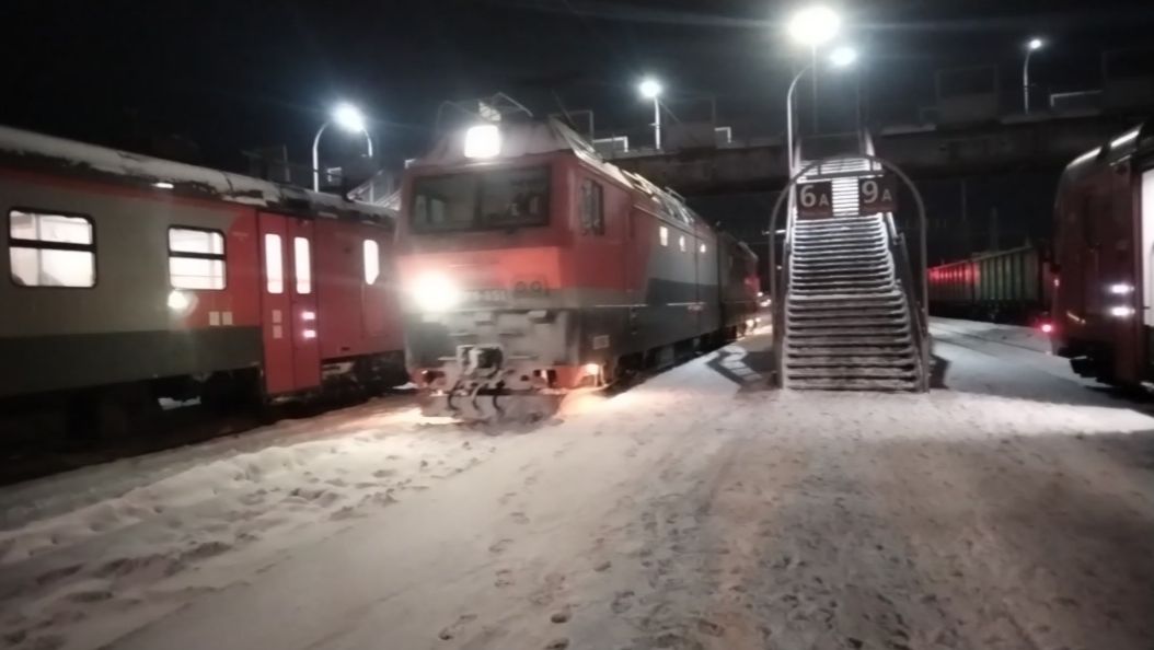 Электровоз 2ЭС6-851 (приписан ТЧЭ-14 Белово ЗСЖД, построен 12 января 2019 года на заводе Уральские локомотивы) следует резервом по Vl пути станции Новокузнецк-Пассажирский, г.Новокузнецк, 06.01.2026 в 20:50
