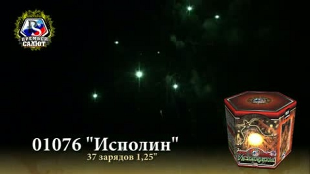 Артикул: 01076 Кол-во зарядов: 37 шт. Калибр: 1.2 " Время работы: 72 с. Высота подъёма: 30 м. Эффект: Зеленые, красные и желтые звезды раскрываются золотым мерцанием с красными и зелеными георгинами, зелеными, желтыми, красными и голубыми георгинами с пестиком эффекта тысячи хризантем. В финале одновременный залп нескольких зарядов раскрывается золотой ивой, переходящей в эффект тысячи хризантем.