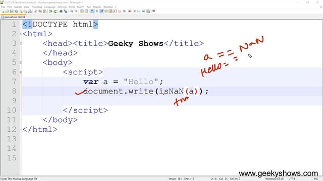 NaN is not equal to Anything in JavaScript You can find out our HTML Complete Video tutorials : http://goo.gl/O254f9 CSS Complete Video Tutorial Playlist: http://goo.gl/On2Bh1 Feel free to share this video JavaScript Complete Video Tutorial Playlist https://goo.gl/A517jQ Check Out Our Other Playlists: https://www.youtube.com/user/GeekyShow1/playlists SUBSCRIBE to Learn Programming Language ! http://goo.gl/glkZMr Learn more about subject: http://www.geekyshows.com/ __________________________________________________________ If you found this video valuable, give it a like. If you know someone who needs to see it, share it. If you have questions ask below in comment section. Add it to a playlist if you want to watch it later. ___________________________________________________________ T A L K W I T H M E ! Business Email: contact@geekyshows.com Youtube Channel: https://www.youtube.com/c/geekyshow1 Facebook: https://www.facebook.com/GeekyShow Twitter: https://twitter.com/Geekyshow1 Google Plus: https://plus.google.com/+Geekyshowsgeek Website: http://www.geekyshows.com/ ___________________________________________________________ Make sure you LIKE, SUBSCRIBE, COMMENT, and REQUEST A VIDEO :) ___________________________________________________________
