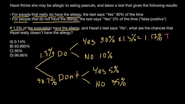 False positives and false negatives "False Positive" redirects here. For other uses, see False Positive (disambiguation). A false positive is an error in binary classification in which a test result incorrectly indicates the presence of a condition (such as a disease when the disease is not present), while a false negative is the opposite error, where the test result incorrectly indicates the absence of a condition when it is actually present. These are the two kinds of errors in a binary test, in contrast to the two kinds of correct result (a true positive and a true negative). They are also known in medicine as a false positive (or false negative) diagnosis, and in statistical classification as a false positive (or false negative) error. In statistical hypothesis testing, the analogous concepts are known as type I and type II errors, where a positive result corresponds to rejecting the null hypothesis, and a negative result corresponds to not rejecting the null hypothesis. The terms are often used interchangeably, but there are differences in detail and interpretation due to the differences between medical testing and statistical hypothesis testing. False positive error A false positive error, or false positive, is a result that indicates a given condition exists when it does not. For example, a pregnancy test which indicates a woman is pregnant when she is not, or the conviction of an innocent person. A false positive error is a type I error where the test is checking a single condition, and wrongly gives an affirmative (positive) decision. However it is important to distinguish between the type 1 error rate and the probability of a positive result being false. The latter is known as the false positive risk (see Ambiguity in the definition of false positive rate, below). False negative error A false negative error, or false negative, is a test result which wrongly indicates that a condition does not hold. For example, when a pregnancy test indicates a woman is not pregnant, but she is, or when a person guilty of a crime is acquitted, these are false negatives. The condition "the woman is pregnant", or "the person is guilty" holds, but the test (the pregnancy test or the trial in a court of law) fails to realize this condition, and wrongly decides that the person is not pregnant or not guilty. A false negative error is a type II error occurring in a test where a single condition is checked for, and the result of the test is erroneous, that the condition is absent. Problem: Hazel thinks she may be allergic to eating peanuts, and takes a test that gives the following results: • For people that really do have the allergy, the test says "Yes" 90% of the time • For people that do not have the allergy, the test says "Yes" 5% of the time ("false positive") If 1.3% of the population have the allergy, and Hazel's test says "No", what are the chances that Hazel really doesn't have the allergy? A) 0.14% B) 93.895% C) 95% D) 99.86% #bayesian #bayes #bayestheorem #falsepositive #Bayersrule #falsepositive #probability #statistics #Genetics #bayestheorem #Bayeslaw #Bayes rule Nikolay's genetics lessons #Calculus #Education #Math #Solution #conditionalprobability #Probability #bayestheorem #BayesianInference #veritasium #bayes #probability #thomas #bayes #bayes #bayesian #inference #math #mathematics #treediagrams #venndiagrams #bayestheorem #Statistics #lawofprobability #BayesRuleFalsePositiveParadox #BayesRule #FalsePositiveParadox #probability #statistics #genetics #BayesTheorem #BayesLaw #NikolaysGeneticsLessons #Calculus #education #math #solution #Conditional #bayes #theorem #BayesianInference #veritasium #BayesTheorem #rule #prior #conditionProbability #thomasBayes #bayesRule #bayesian #inference #mathematics #treeDiagrams #vennDiagrams #lawOfProbability https://www.youtube.com/watch?v=iUV0K2Tl8NM