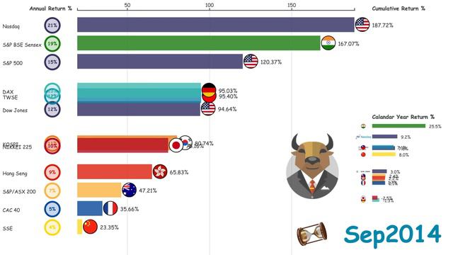A historical racing bar chart of global top stock exchanges accumulated returns after 2008 economic crisis and US housing bubble. Find out the best country to invest in stock market from their historical performance! Discover historical annual stock market returns by country! Bar chart race of the best performing major stock markets from 2009 to 2019. Major bar chart ranking is based on cumulative return in percentage since January 1st, 2009, while minor bar chart ranking is cumulative return in percentage for each specific calendar year. Annual Return is how much you earn annually on average if you invested on January 1st, 2009 and hold until November 30th, 2019. Have Fun Learning with DocTheDuck !!! - - - - - - - - - - - - - - - - - - - - - - - - - - - - - - - - - - - - - - - - - - - - - - - - - - - - - - - - - - - - - - - Data Source: Yahoo Finance