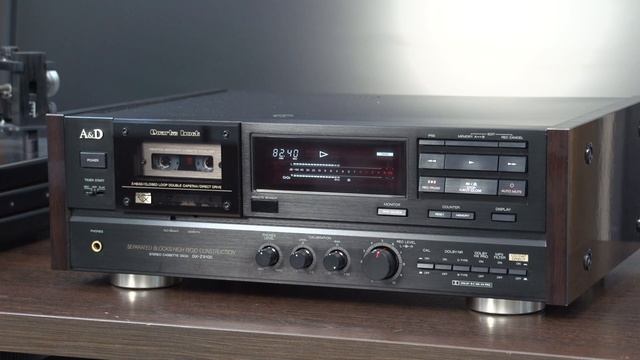A&D GX-Z9100 3HEAD CASSETTE DECK ¥108,000 A&Dが1988年に発売したカセットデッキ。A&Dは,1987年に赤井電機と三菱電機が提携して発足させた 新ブランドでした。A&DになってGX-Z9000,7000,というワンウェイ3ヘッドのカセットデッキを発売しました が,これはAKAIブランドで発売されていたGX-93,73とほぼ同一で,細かなブラッシュアップを行い型番を変 えたものでした。そして翌年1988年の10月にA&Dブランドとして,AKAI時代のGX-9,GX-93以来の設計 を受け継ぎつつ本格的に新開発され たのがGX-Z9100,GX-Z7100のシリーズでした。そしてシリーズの最 上級機がこのGX-Z9100でした。 GX-Z9100の最大の特徴は,「セパレートブロック・コンストラクション」と称するデッキ全体のコンストラクション にありました。メカニズムや電機系が複雑に絡み合うデッキのコンストラクションをいったん解体し,各パートのク オリティを高めた上で,デッキの各ブロックを分離独立させたものでした。メカニズム,電源,マイコンを搭載した コントロール基板,バイアス基板,ディスプレイ基板の振動・ノイズ発生源をきめ細かくインナーシャーシで分離す るとともに,微少信号を扱うアンプ部をこれらから完全にセパレートさせ,ヘッドからの信号伝送への干渉を防ぎ 微少レベルの情報や音場の再現性を高めたものでした。さらに,インナーシールドシャーシ,サイドシャーシ,底 板には銅メッキ鋼板を使用し,磁気歪み防止効果を高め,デッキ部とアンプ部を独立させたセパレートデッキに 匹敵する効果を得ていたというものでした。 GX-Z9100では,さらに電源部を徹底して独立化させることで電源廻りでの相互干渉を防ぎ音質の向上を図っ ていました。電源トランスの巻線をアンプ,システム・コントロール,表示系の各ブロックごとに独立させ,安定化 電源も,イコライザー回路,Lチャンネル・ドルビー回路,Rチャンネル・ドルビー回路,ヘッドホンアンプの各ブロッ クごとに独立の無帰還型電源を搭載していました。さらに,イコライザー回路の録音側と再生側独立も図り,合計 5つの安定化電源を搭載するという徹底した独立電源になっていました。電源トランスは,磁束漏れが少なく,レ ギュレーションに優れたサーキュラートンラスを搭載し,+側と-側も独立巻線として,電源まわりでの相互干渉 を徹底して抑えていました。電源コードは極性表示付のOFC電源コードが使用されていました。 テープ走行系は,歴代のAKAIのデッキに搭載されてきたクローズドループ・ダブルキャプスタン・DD方式を採用 し,安定したテープ走行を実現していました。GX-Z9100では,さらにキャプスタンのDDモーターをクォーツロッ ク制御し,走行性能をより高めていました。さらに,安定したテープ走行を長期にわたって維持できるように,表面 平滑性,硬度,制振性に優れたセラミック・コンポジット材のテープガイドを採用していました。 GX-Z9100では,上記のセパレート構造に加え,筐体のトータルな制振化・高剛性化を行っていました。高剛性 なサイドウッドパネルの装着,制振性に優れたセラミックコンポジット材を採用した大型のインシュレーターが新た に採用されていました。さらに,音質を劣化させるというカセットハーフの振動を抑えるため,2.5mm厚のアルミ 板と2.0mm厚の鋼板,そして高い振動吸収特性を持つ新素材「ソルボセイン」を組み合わせたカセット・スタビラ イザーを装着し,カセットハーフを広い面積で抑え,有害振動を吸収して,音のクリアネスを高めていました。 ヘッドはAKAI以来伝統のスーパーGXヘッドを搭載していました。さらに,GX-Z9100では,ヘッドの巻線に伝送 歪みの少ないLC-OFCを採用していました。 GX-Z9100では,録音/再生アンプに単体プリアンプ並のクオリティを誇る完全ディスクリート構成完全直結アンプ を搭載していました。特にデッキの音質を決定づけるといわれるイコライザー回路には,AKAI以来のA&D独自の 無帰還型オープンループサーキットを採用し,カセットデッキで初めてオーバーオールのNFBを取り去っていました。 バイアス回路は,バイアス発振周波数を210kHzと従来の2倍以上に引き上げたハイフレケンシー・バイアス回路を 搭載し,バイアス信号と音楽信号の干渉によるビート発生を抑えていました。 機能的には,内蔵CALを利用して調整ができるバイアス及び録音レベルのマニュアルキャリブレーション機構が搭 載されていました。ノイズリダクションとしてドルビーB/Cが搭載され,高域特性を改善するドルビーHXプロシステ ムも採用されていました。メカニズムは,AKAI・GX-F91以来の設計が受け継がれ,サイレントメカニズム,カセット ドアがモーターで開くダイレクトリードイン&パワーイジェクト,モニター切換が自動化されたオートモニター,オートテ ープセレクターなど使いやすく洗練された操作系になっていました。カウンターはリアルタイムカウンターで,レベル メーターを含むディスプレイは音質への影響を考え,ディスプレイオフスイッチが設けられていました。 そのほか,A・Bリピート機能,IPSS(最
