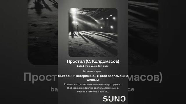 Баллада. Текст - С. Колдомасов Аудио и визуал - Suno AI Стихи: Сергей Колдомасов - "Простил" (2021/06/01) (на сайте стихи.ру). Никакой вульгарщины или пропаганды, все совпадения чисто совпадения!